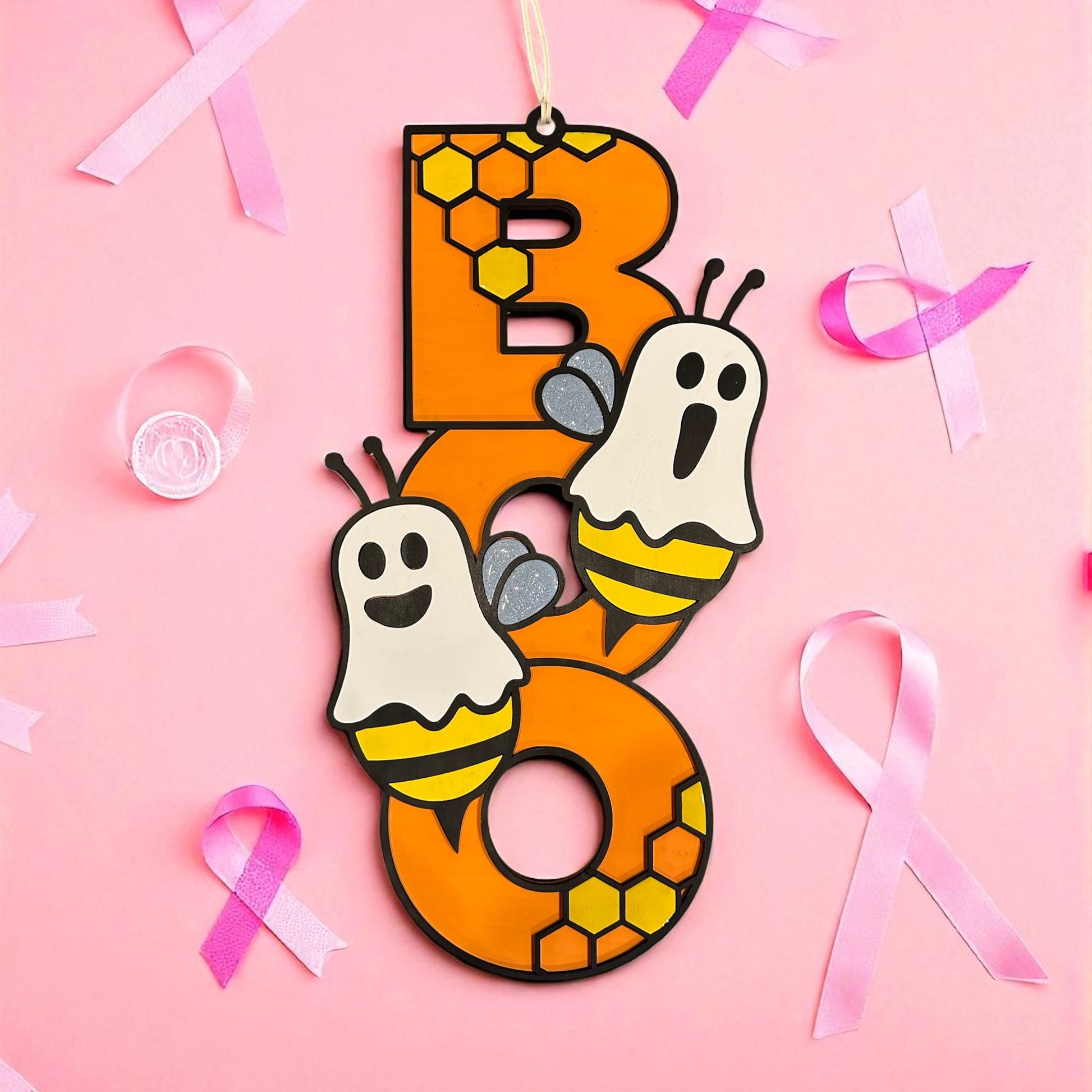 The bold, bright orange "BOO" is playfully decorated with honeycombs and flanked by two adorable Ghost Bees with sparkly wings. It's the perfect blend of spooky, sweet, and unique! Each piece is lovingly crafted and hand-painted, ensuring your door hanger is as unique as your home. We pour our hearts into every brushstroke to create a piece that truly pops against your door.