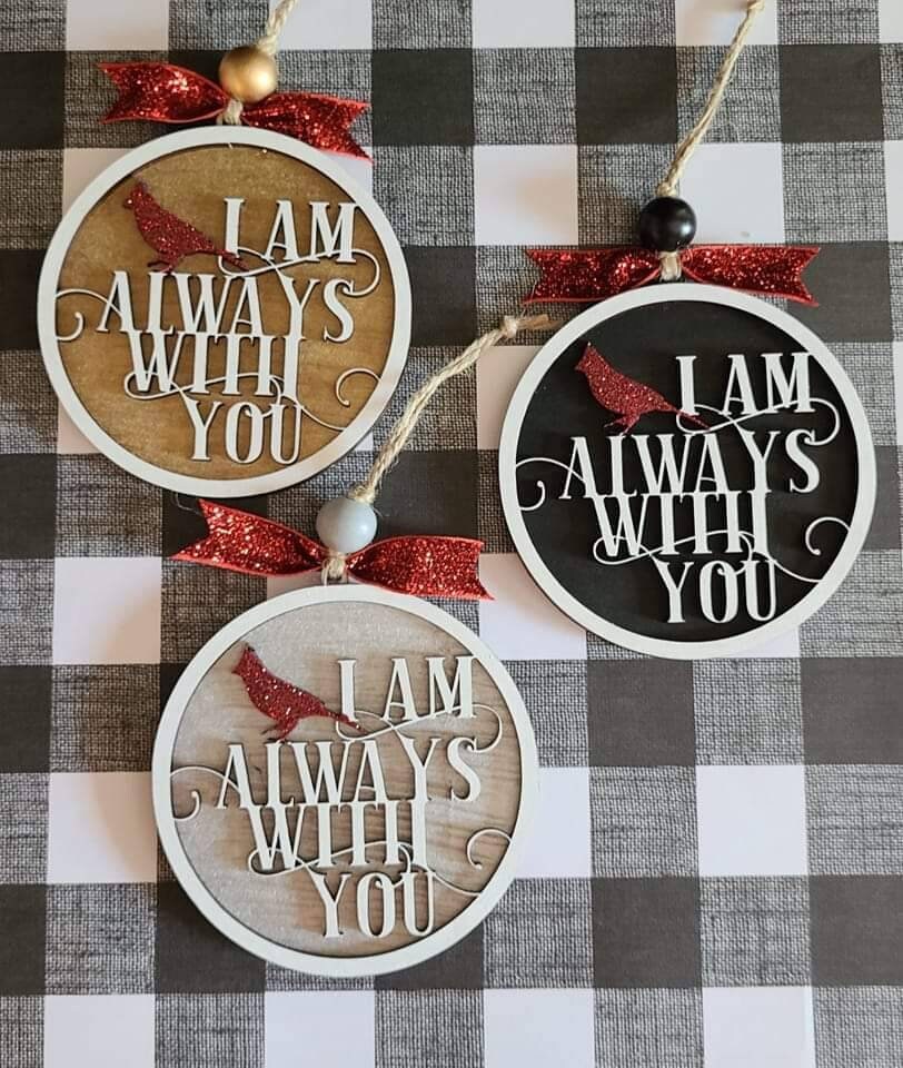 This heartfelt Cardinal Memorial Ornament is a beautiful way to honor the memory of a loved one during the Christmas season. 🎄 Each ornament is meticulously handcrafted on a 4x4 inch birch wood round and features a delicate cardinal, its vibrant red feathers symbolizing hope and remembrance. ❤️ The touching sentiment "I am always with you" is elegantly inscribed, offering a comforting reminder of their enduring presence.